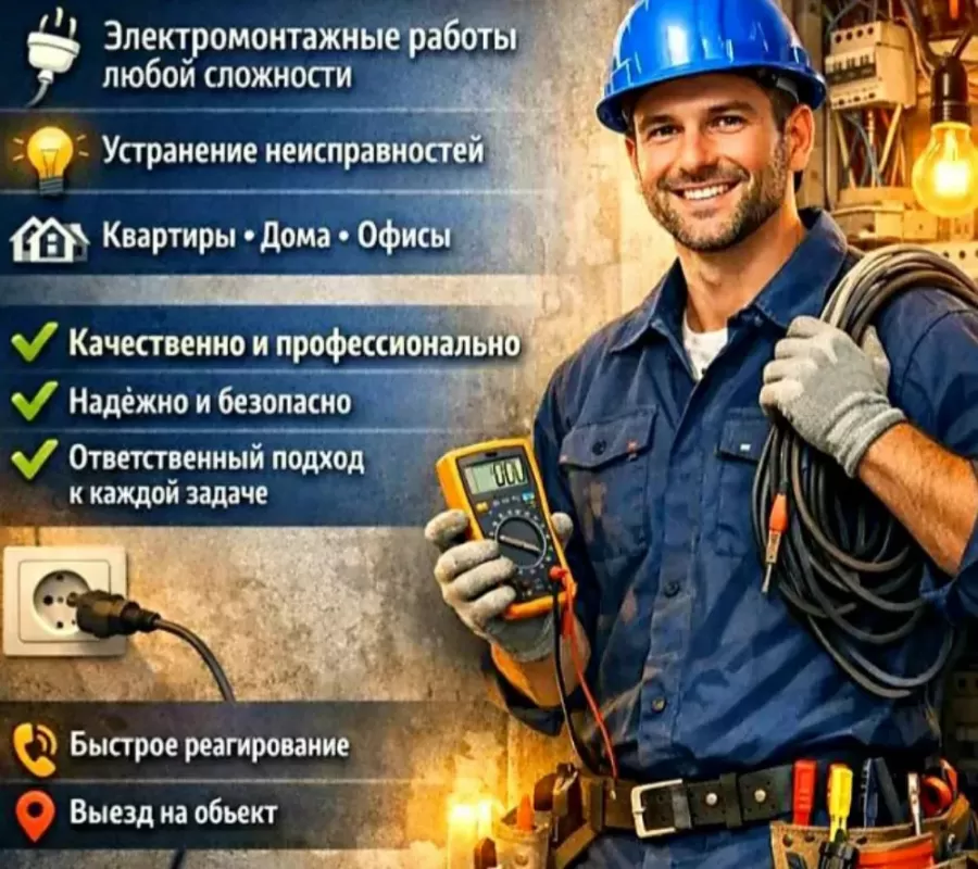 Мы готовы предоставить вам качество и долгую службу вашей электрике. ⏳ Работаем качественно, аккуратно и надёжно а так же в быстрые сроки. Стаж 10 лет👌 Оказываемые нами услуги 🧾: 1) Электромонтаж любой сложности 🛠️ 2) Замена и установка электрокомплектов которые выведены из строя 🪛 3) Все электрические работы которые связаны в доме и вне ⚡ 4) Установка и ремонт мелкой бытовой техники (электроплиты, варочные